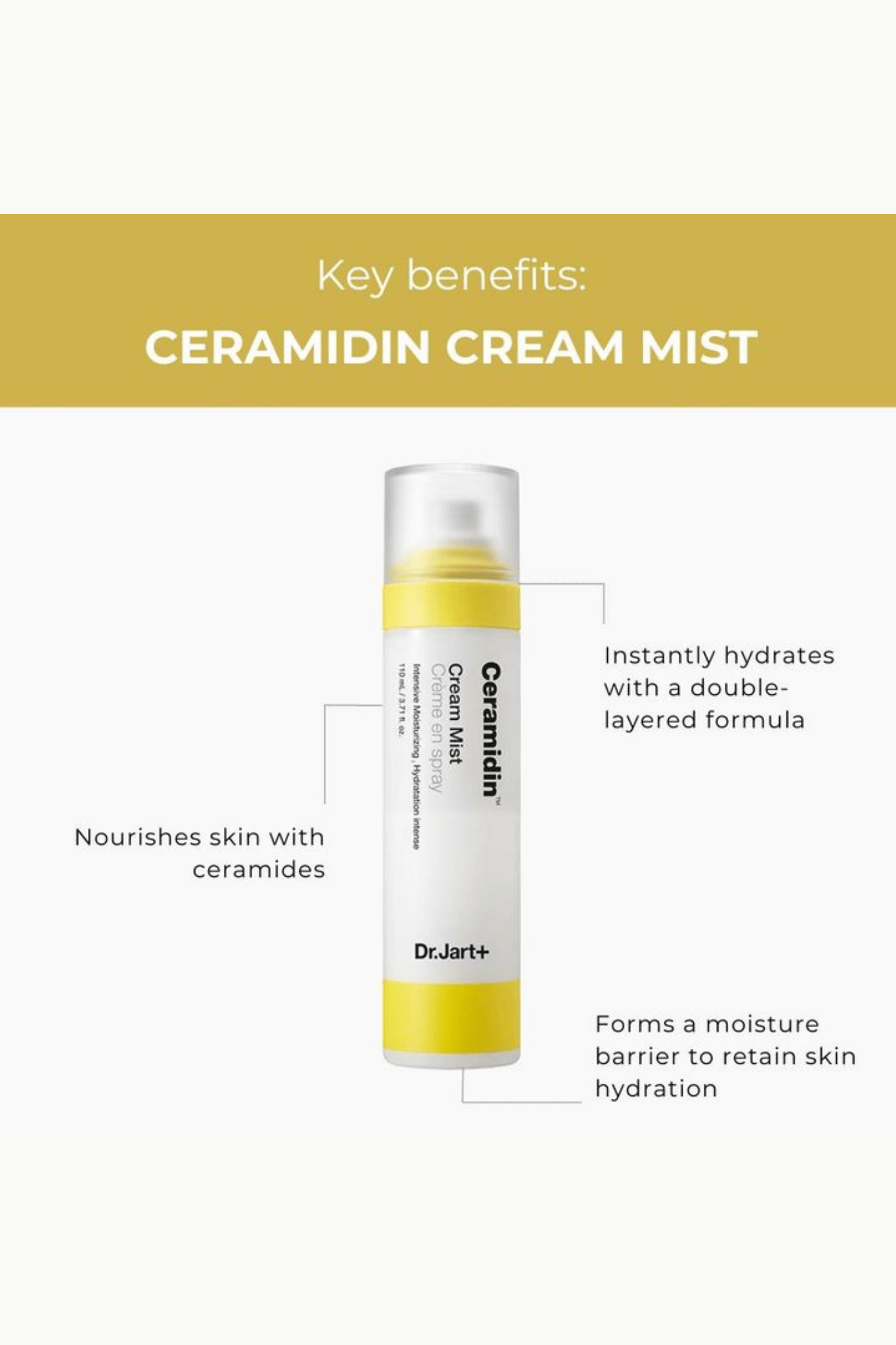 A Ceramidin Cream Mist, a quick-fix solution for dry skin's immediate hydration needs. Infused with a Ceramidin Complex, it fortifies your skin's natural moisture barrier, preventing moisture loss and leaving your complexion smoother and more supple. This mist doubles as a toner after cleansing, ensuring your skin stays hydrated and comfortable throughout the day. Perfect for on-the-go moisture touch-ups, its dermatologist tested and ideal for dry skin types. Suitable for normal, dry and sensitive skin.